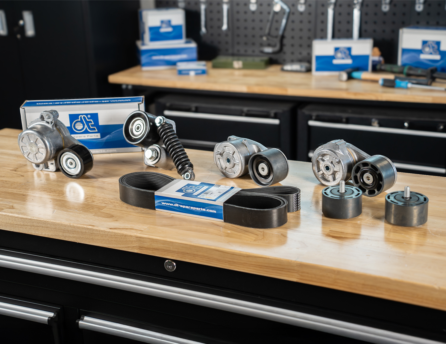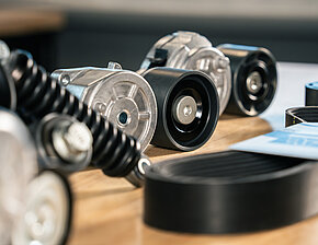 Foutpatronen uiten zich meestal door middel van geluiden of door de geur van heet rubber. Deze geur ontstaat wanneer de riem slipt. De daarbij vrijkomende warmte veroorzaakt verbranding of verkoling van het riemmateriaal. Onder normale omstandigheden lopen de lagers vrijwel geruisloos. Problemen kunnen ontstaan door uitgespoelde lagers als gevolg van verontreiniging, externe beschadiging of thermische overbelasting. In dergelijke gevallen is het niet noodzakelijk om de complete riemspanner te vervangen: de rollen zijn afzonderlijk verkrijgbaar bij DT Spare Parts. Bij montage moeten de voorgeschreven aanhaalmomenten en het gebruik van schroefborging in acht worden genomen, aangezien de bouten door trillingen los kunnen komen. Wanneer het geluid zich hoorbaar “verplaatst” tussen de aangedreven componenten, is er meestal sprake van een probleem met de riem of de riemspanner. Is het geluid statisch en niet direct te lokaliseren, dan raden wij aan om een ratelverlengstuk, lange schroevendraaier of slang te gebruiken. Door het hulpmiddel tegen afzonderlijke componenten te houden, kan de geluidsbron stapsgewijs opgespoord worden, demonstreert Parts Specialist Niklas.