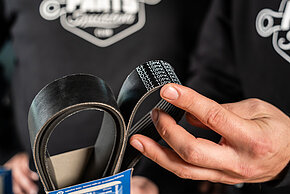 “Voordat de riem wordt vervangen, is het belangrijk de riemgeleiding vast te leggen – bij voorkeur met een schets of een foto”, legt Niklas uit. De reden: een correcte riemgeleiding is essentieel voor een goede werking van de volledige riemaandrijving. Wanneer de riem verkeerd wordt geïnstalleerd, kunnen aangedreven componenten niet goed werken, met schade of uitval tot gevolg. Daarnaast moet het riemprofiel worden gecontroleerd op beschadigingen, inloopsporen of scheuren. Bij oudere riemen kan na herinstallatie geluid optreden wanneer de riem in de tegenovergestelde richting wordt geïnstalleerd ten opzichte van de oorspronkelijke looprichting. In dat geval is het raadzaam vóór demontage de draairichting op de riem te markeren (bijv. met een waskrijt of een witte lakmarker). Wanneer het systeem meerdere riemen bevat, is het eveneens nuttig om kort te markeren welke riem welke componenten aandrijft. Verder wordt aanbevolen om bij elke riemvervanging alle lagers te controleren op afwijkende geluiden of overmatige speling. Controleer ook omloop- en spanrollen: de lagers moeten schoon zijn en geluidloos draaien. De parallelstand van de lagers is eveneens van groot belang, omdat een verkeerde positionering ertoe kan leiden dat de riem van de poelie wordt geworpen.